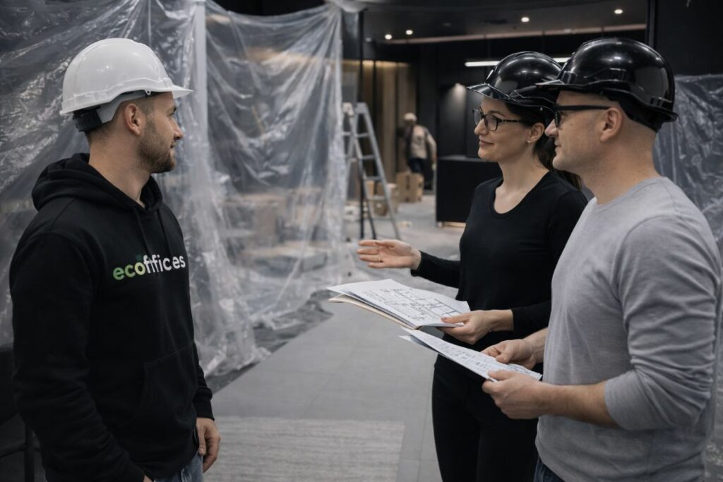 Równolegle prowadzony jest nadzór nad jakością wykonania, zgodnością z dokumentacją oraz kolejnością robót technicznych. Takie podejście pozwala utrzymać kontrolę nad harmonogramem, zakresem zmian i efektem końcowym modernizacji biura.