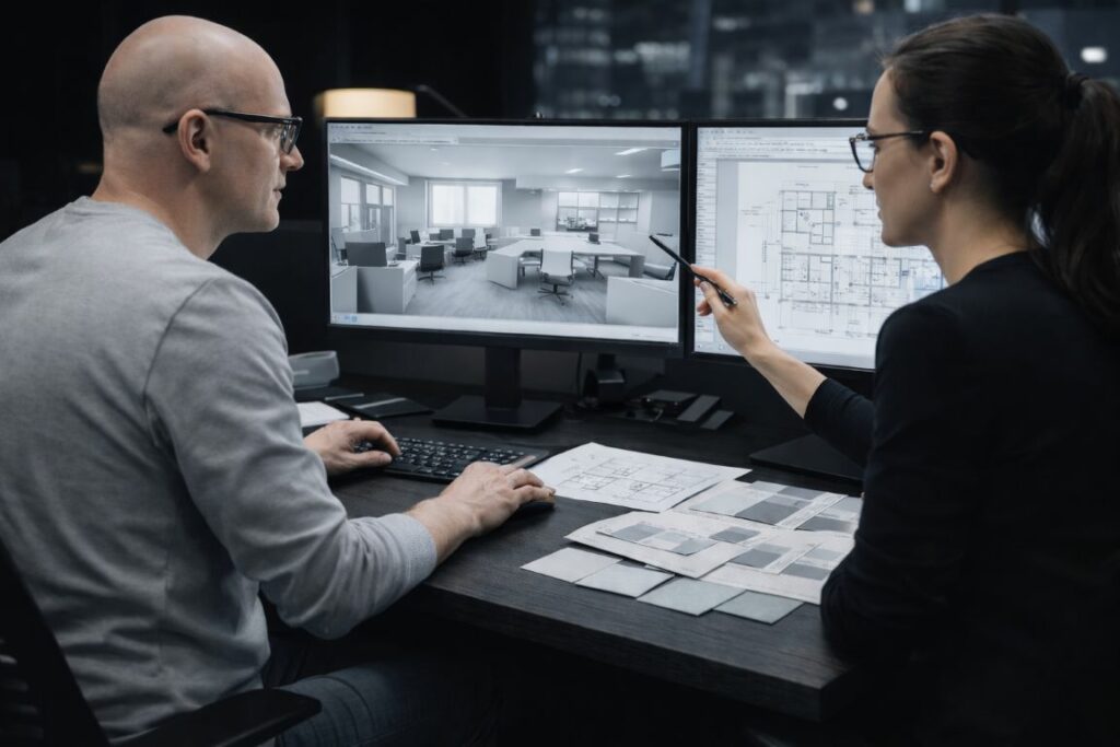 Na tym etapie określamy docelowy kierunek modernizacji biura, oparty na sposobie pracy zespołów, strukturze organizacyjnej oraz rzeczywistych potrzebach użytkowników przestrzeni. Analizujemy, które elementy wymagają przebudowy, a które jedynie reorganizacji, aby biuro było czytelne i funkcjonalne.